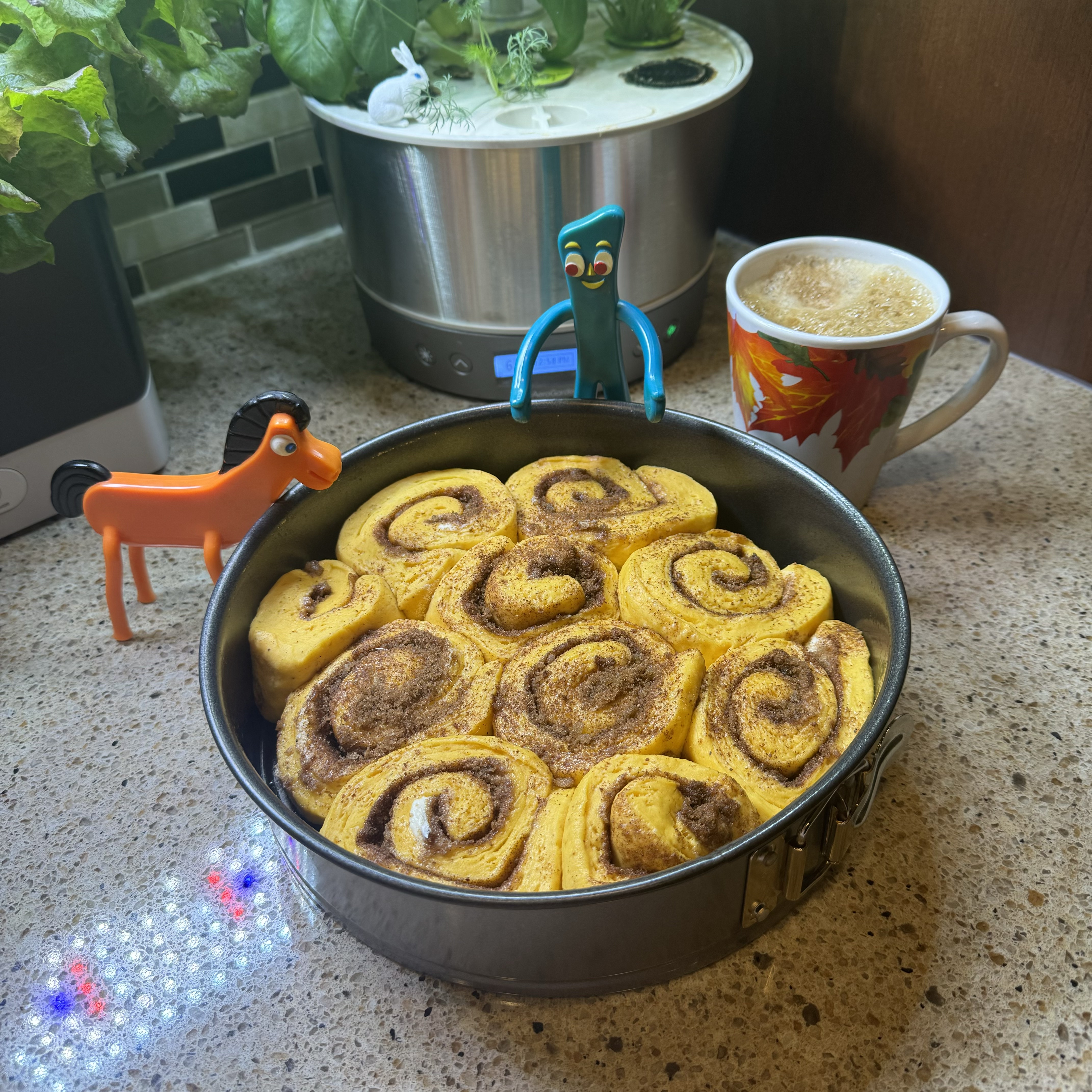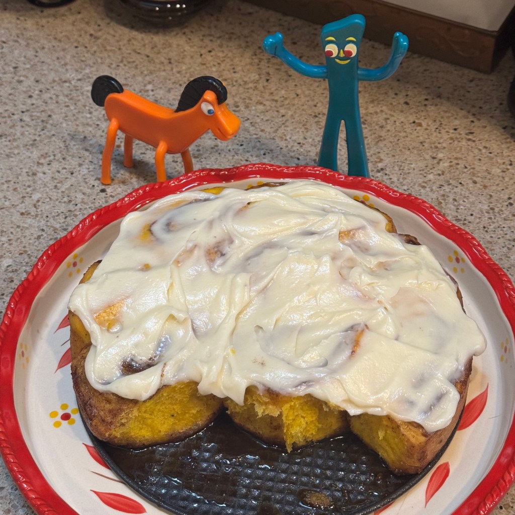 I went into a baking frenzy when the weather started to get chillier. These Pumpkin Cinnamon Rolls were my favorite project. They were surprisingly easy to make and oh, so delicious with the Cream Cheese Frosting on top! Gumby and Pokey, my kitchen helpers, thought they were scrumptious.
