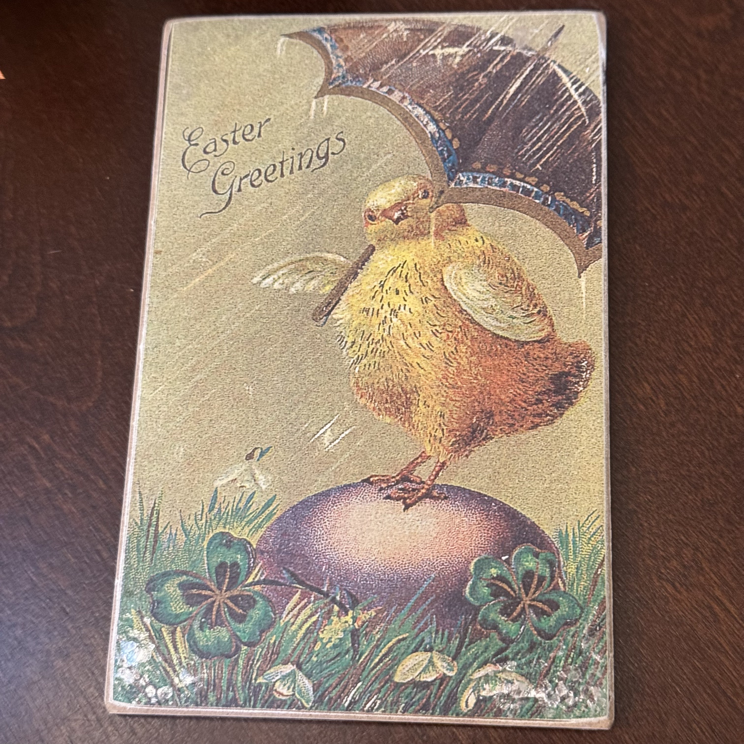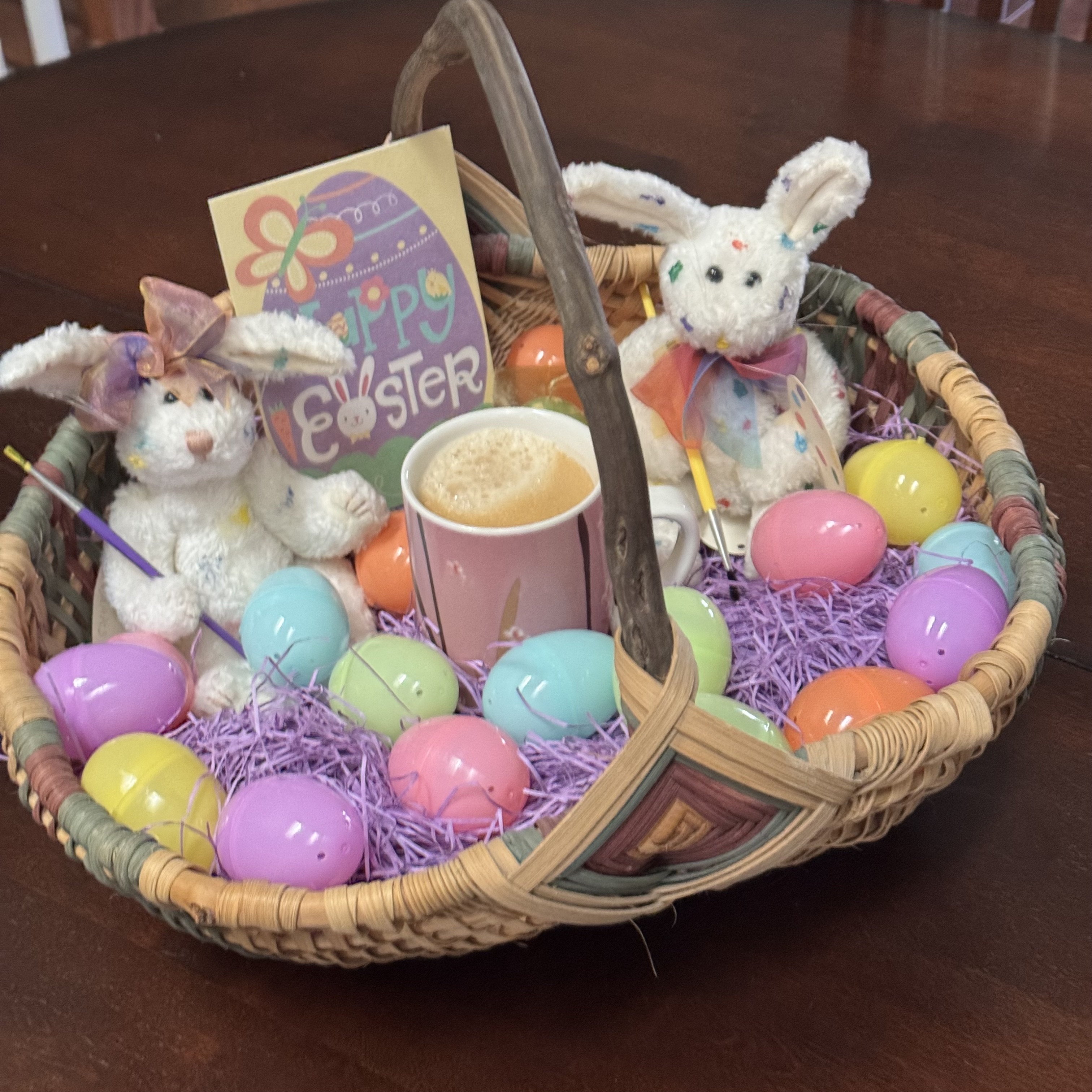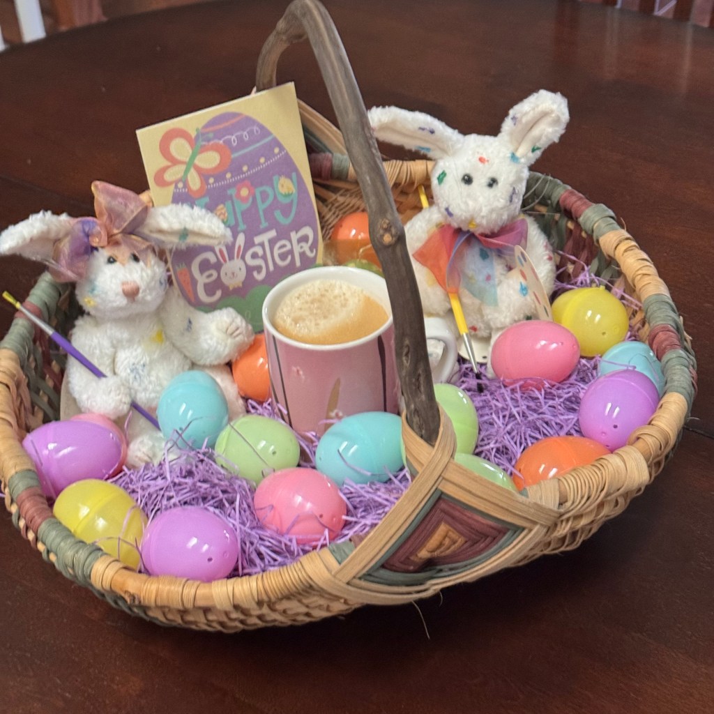 This month has flown by! The artsy bunnies had their hands full coloring eggs and the coffee helped them keep at it. But when the day came, it was a tad cloudy and damp, so the little chick sending Easter Greetings was appropriate.